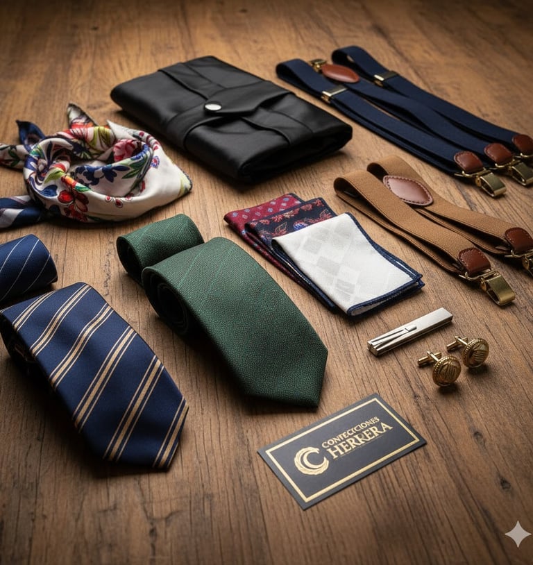 Completamos tu look con una selección exclusiva de accesorios elegantes: corbatas, fajines, pañuelos, tirantes y más.